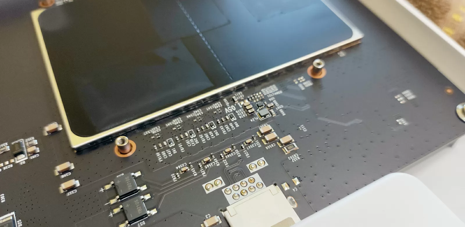 Для охлаждения радиомодуля здесь выбрано самое простое решение, две алюминиевые теплопроводящие пластины, выступающие так же экраном от ВЧ помех. На фото видно только пластину с фронтальной стороны, а вторая есть и со спины, правда добраться до неё и сфотографировать не удалось.