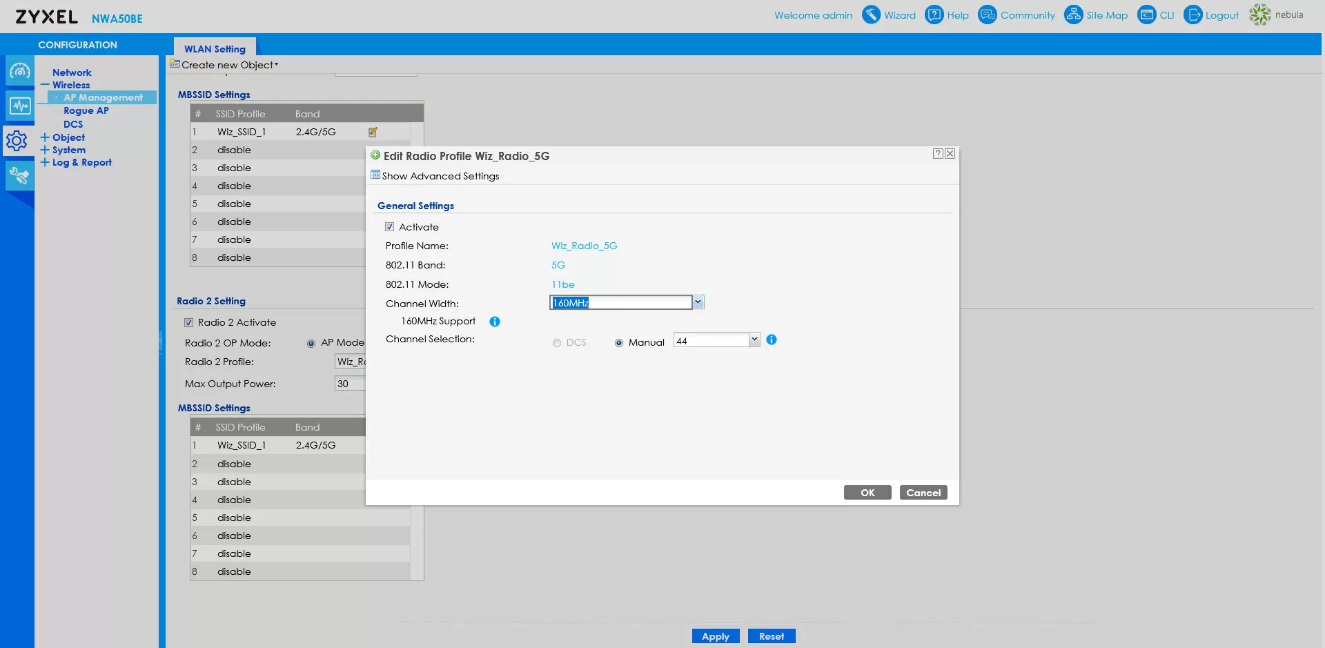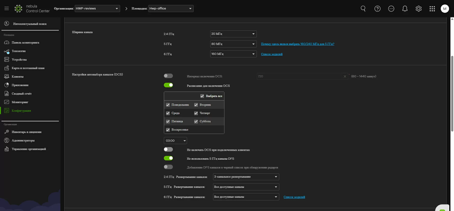 Если вы хотите использовать 240-МГц канал в диапазоне 5G, то вам обязательно придётся использовать управление через Nebula Control Center. Дело в том, что ширина канала 240 МГц не лицензирована в Европе, и заблокирована на уровне прошивки в точках доступа для европейского рынка. Что вам нужно сделать, так это в конфигурации площадки Nebula установить регион США, после чего выбрав диапазон 5 ГГц, нажать на точку доступа и поставить ширину канала 240 МГц. Проделать эту процедуру в собственном web-интерфейсе европейской точки доступа нельзя, а что можно – сейчас узнаем.