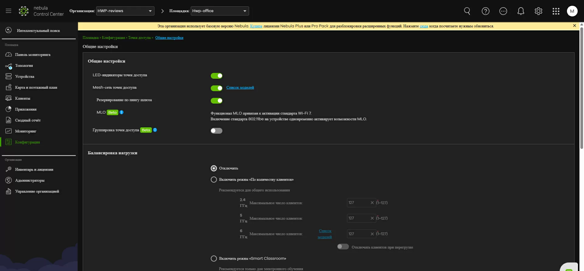Настройка любых точек доступа Zyxel в облачном интерфейсе Nebula Control Center сводится к добавлению устройств на площадку организации и указанию параметров SSID сетей. Для того, чтобы задействовать Smart Mesh, нужно включить эту функцию у каждой точки доступа индивидуально и в конфигурации площадки Site-wide > Configure > Access Point > AP & port settings