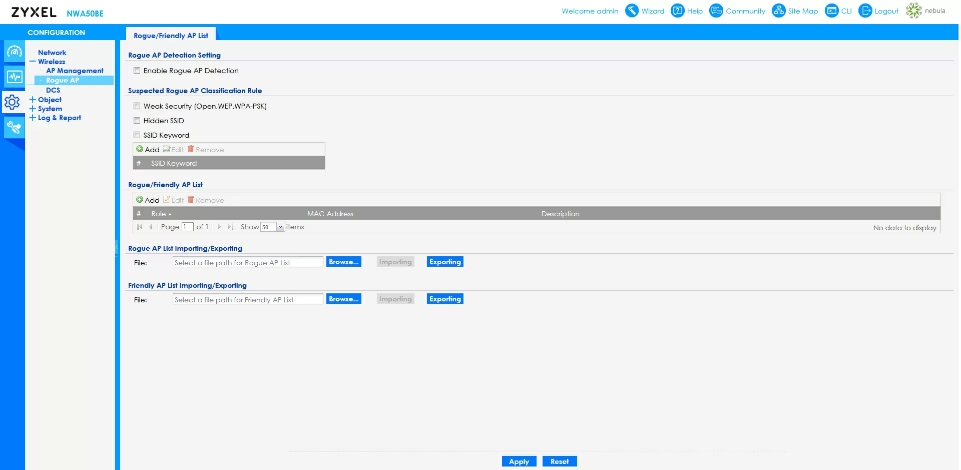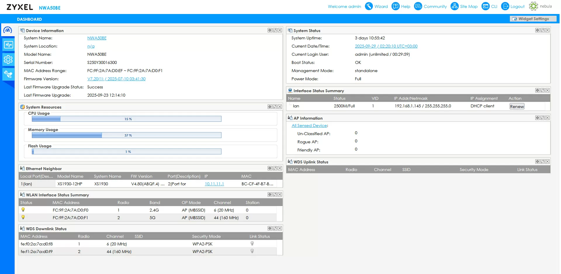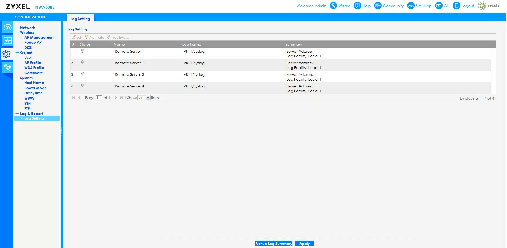 Для пакетной настройки, в веб-интерфейсе доступна командная строка помимо SSH, есть встроенный файловый менеджер для работы с конфигурациями и FTP для их загрузки, что облегчает массовую настройку на больших объектах. Zyxel NWA50BE предоставляет обширную информацию через SNMP и поддерживает отправку логов на четыре удалённых syslog-сервера.