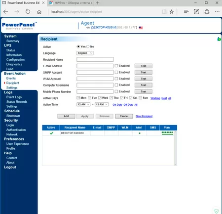 Программное обеспечение CyberPower PowerPanel Business Edition рассчитано на бизнес-структуру. Это не просто маленькое окошко со значениями напряжения и нагрузки, это клиент-серверное приложение, работающее при подключении ИБП к компьютеру через USB или SNMP плату. Оно позволяет производить настройку всех тех параметров, что и через экран, но удаленно, а так же включать оповещения по E-Mail или SMS для различных ситуаций.