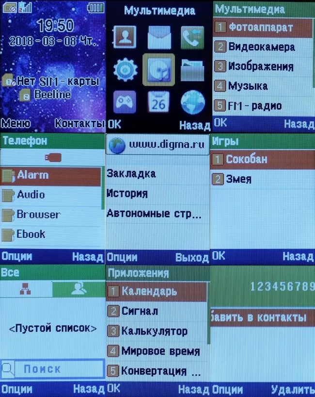 Теперь поговорим о меню. Телефонная книга – на 300 контактов, у каждого контакта всего 1 поле для имени (10 символов кириллицы, либо 20 - латиницы) и 1 поле для телефонного номера. Есть куча дополнительного функционала: пара игр, FM-приёмник и аудио-плеер, диктофон, календарь, будильник и калькулятор.