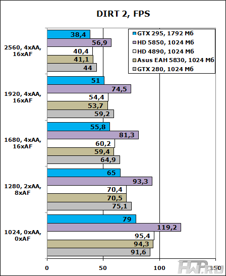 DiRT 2 – первая игра, в которой использовались основные возможности DirectX 11, и даже несмотря на то, что использование новой библиотеки ограничено, игра была использована в эксклюзивном порядке для продвижения продукции AMD (также первой начавшей продвижение DX11). В данном случае мы решили не тестировать игру в режиме DX 11, так как это приведет к «нечестному» сравнению результатов между многими картами.