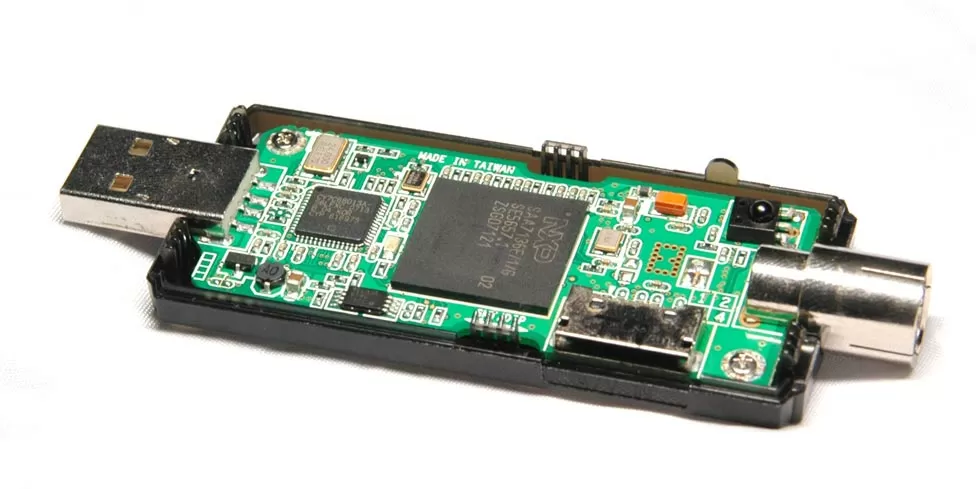 Но, пришло время заглянуть внутрь ТВ-тюнера и выяснить, из чего он сделан. Крышка корпуса снимается очень легко, и под ней мы видим чип NXP SAA7136E, USB 2.0 -контроллер Cypress CY7C68013A, один ИК-датчик и порт для подключения разветвителя.