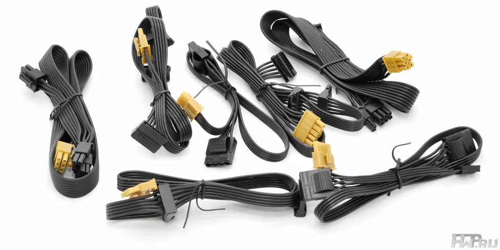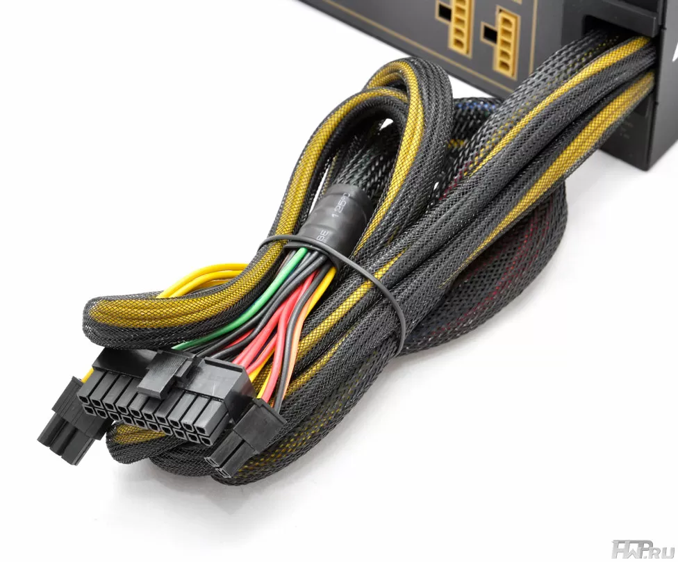 В необходимый набор кабелей входит питание для материнской платы (20+4 штырьковый коннектор), дополнительное питание для процессора (4+4 штырька) и один PCI-e (6+2 штырька). Остальные кабели вы можете подключать по мере надобности.