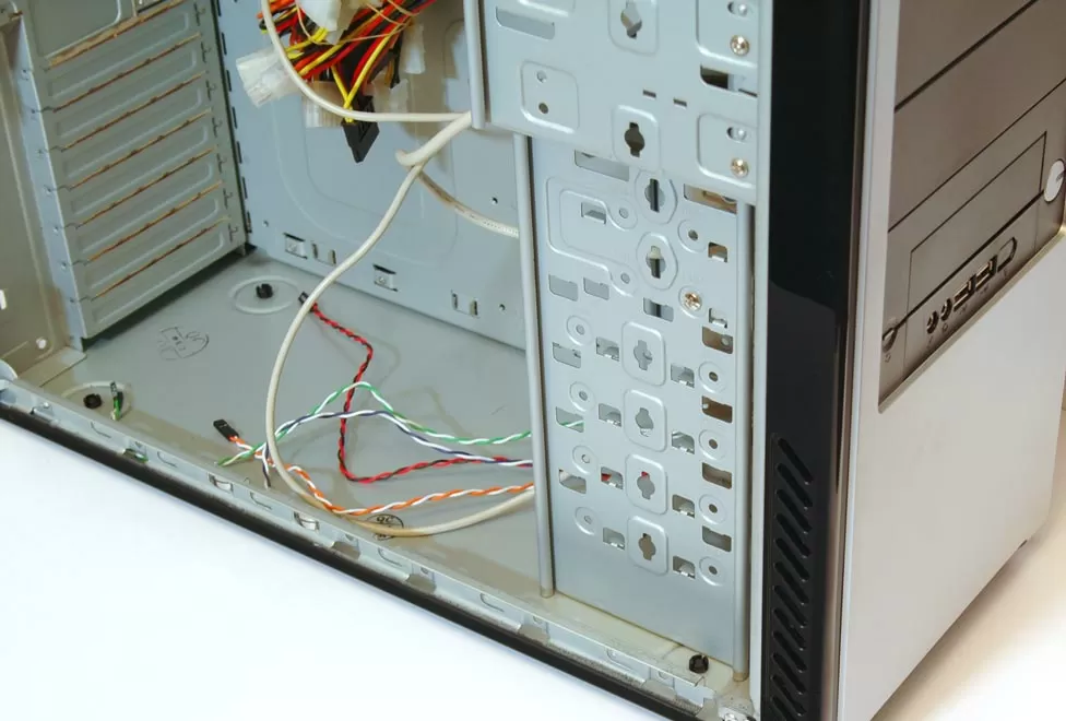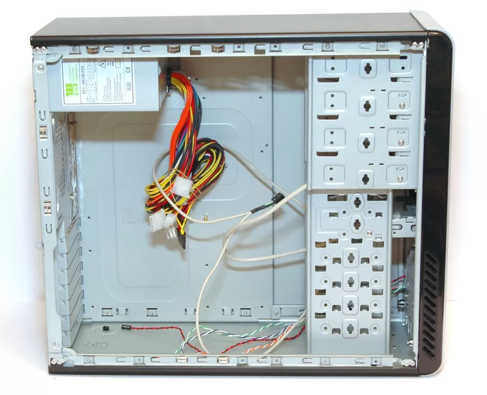 Как вы можете видеть, изнутри корпус выглядит очень просто. В нём достаточно места для размещения любой конфигурацией. Обратите внимание на металлические изогнутые скобы на каркасе корпуса со стороны съёмной крышки. Они играют роль пружинок при установке левой стенки корпуса и не дают ей вибрировать и дребезжать.