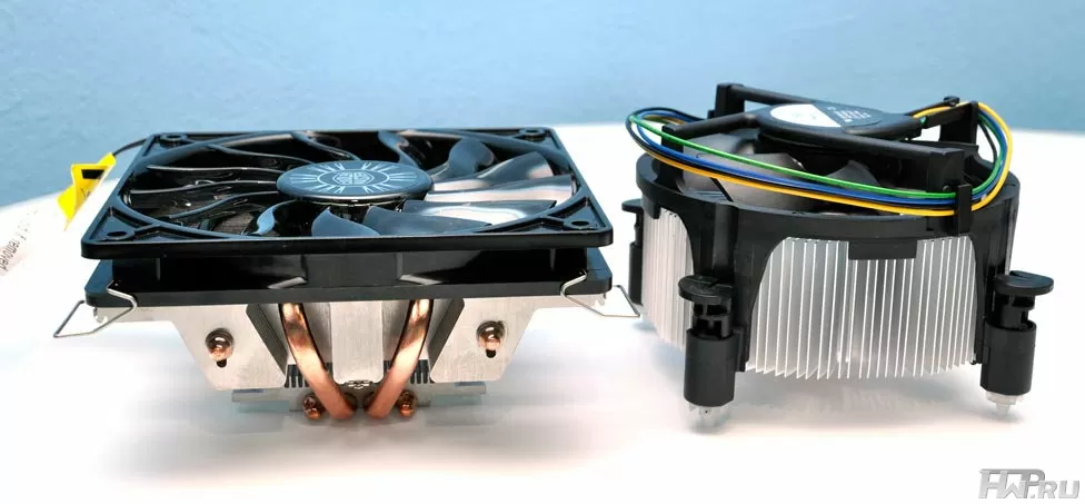 Мы протестировали кулер Cooler Master GeminII M4 в двух вариантах - на минимальной скорости и на максимальной и сравнили с оригинальным кулером Intel под Socket 775.