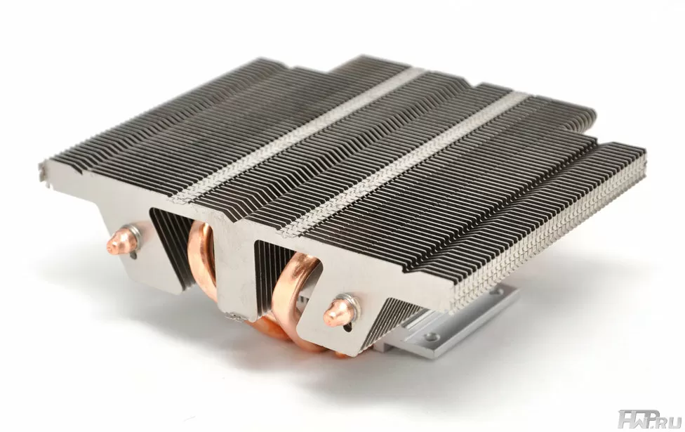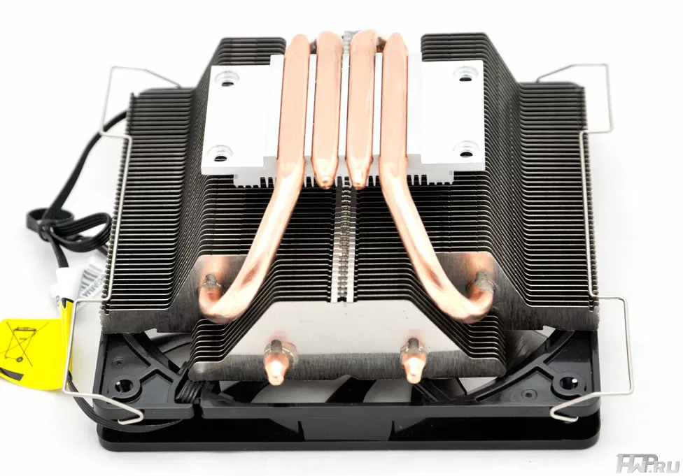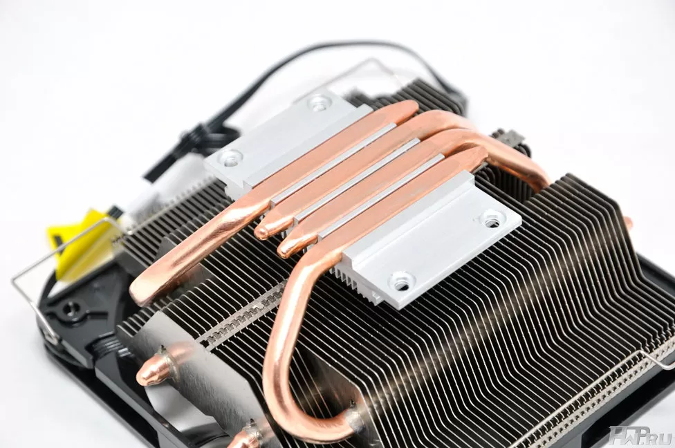 Хорошо, что производителю удалось уместить сюда целых 4 теплопроводящих трубки, да еще и разместить их несимметрично в массиве пластин, чтобы равномерно распределять по ним тепло.