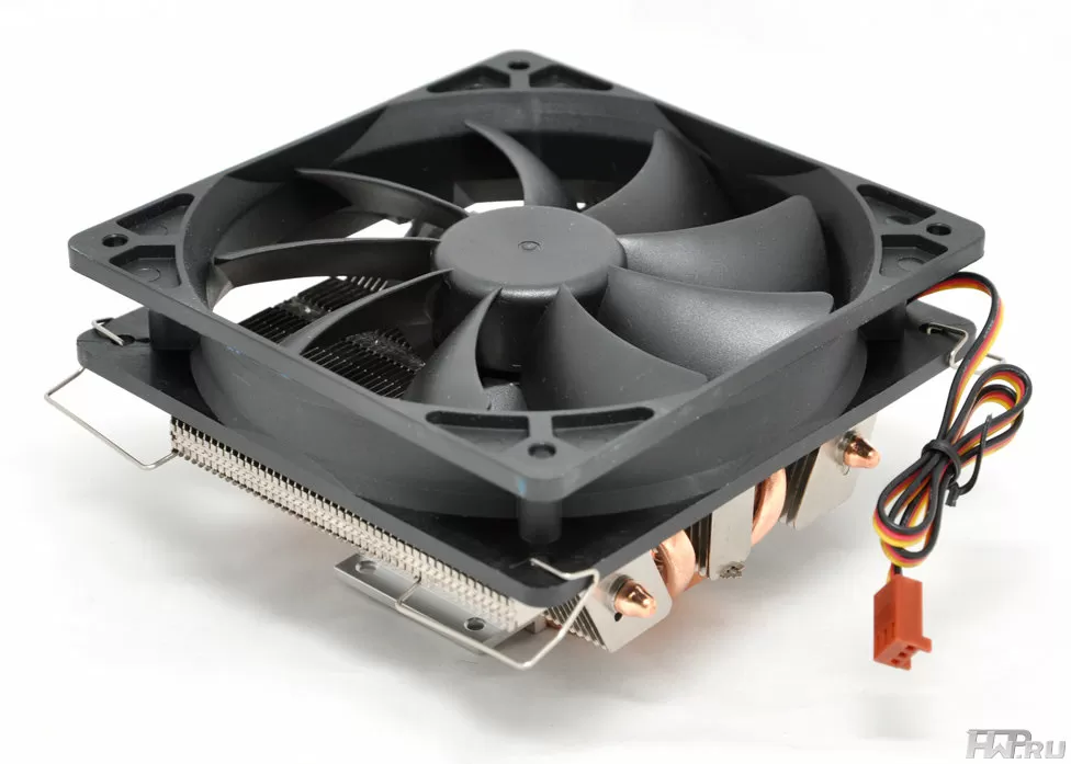 Воздух от вентилятора свободно проходит через радиатор, и ближе к центру, где давление воздуха ниже, высота радиатора выше. Тем не менее, воздушный поток достаточно будет обдувать материнскую плату, чтобы охладить и северный мост и элементы питания, и может быть, ближайший модуль памяти.