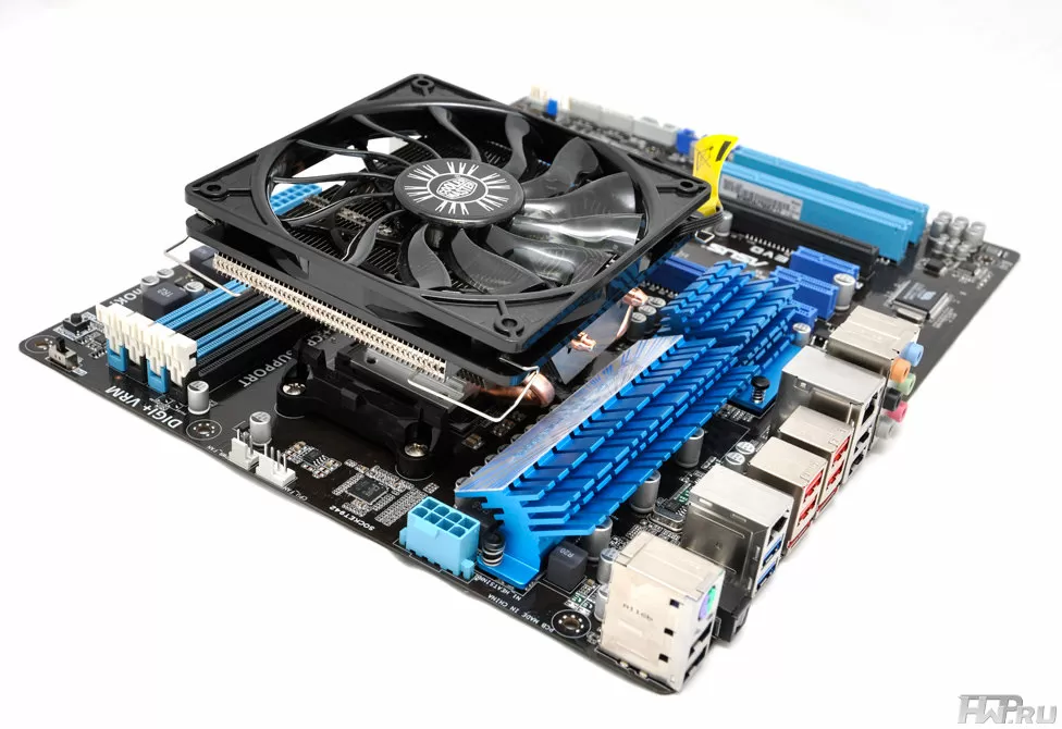 Желающие насладиться инженерными решениями, могут бесконечно долго смотреть, как изгибы теплопроводящих трубок прячутся в вырезах пластин радиатора, а основание укрепляет миниатюрный микро-радиатор. Широкая часть радиатора расположена на высоте 20м, так что проблем с высокими конденсаторами быть не должно. Разве что, если вы используете высокие модули памяти с радиаторами.