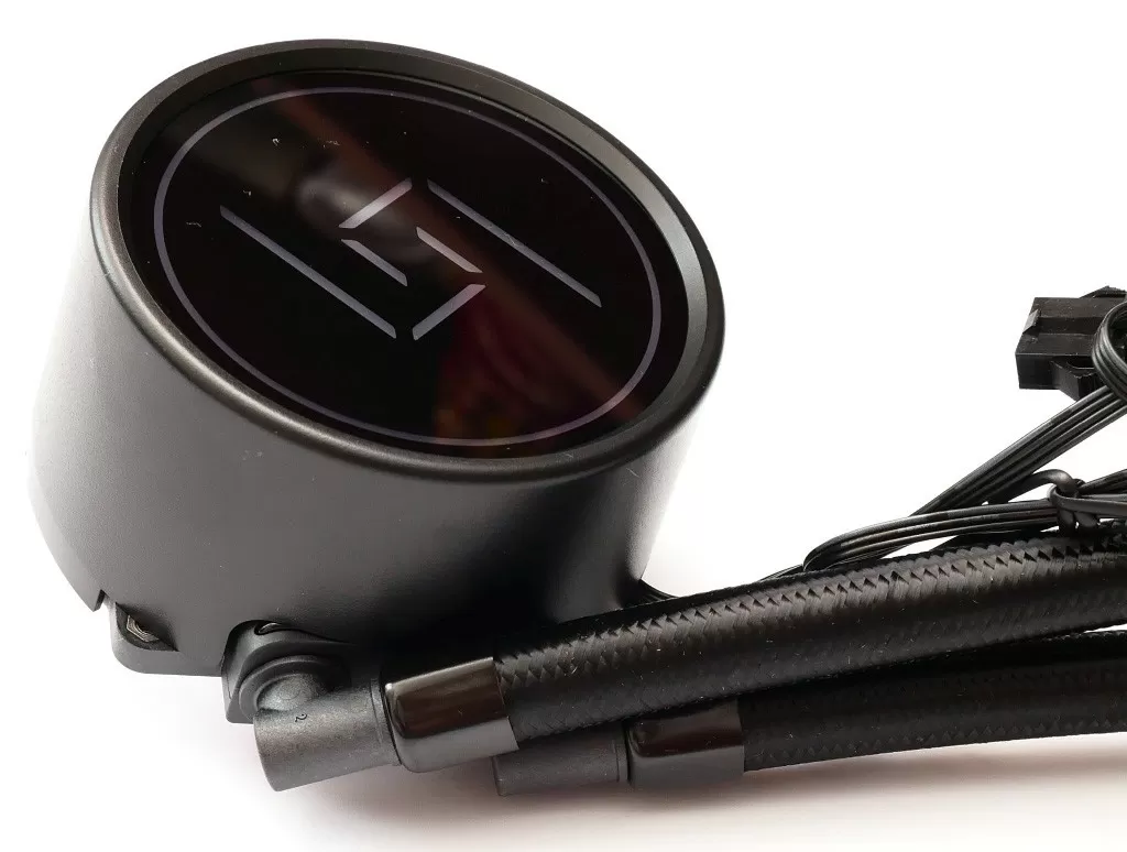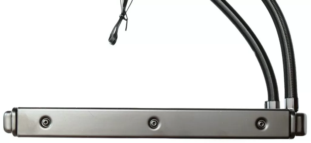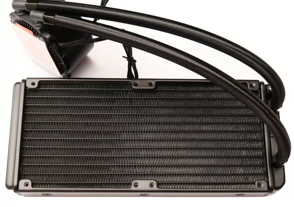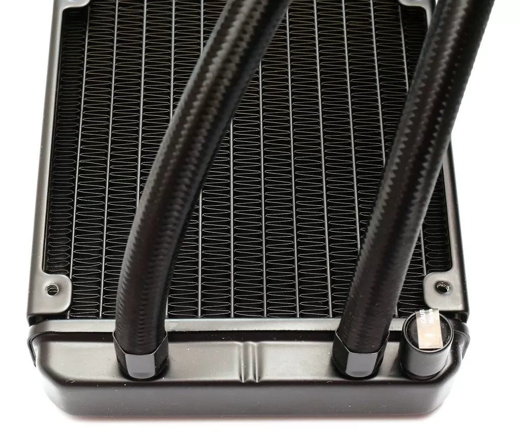 Помпа соединена с водоблоком трубками, которые вполне хорошо гнутся, хотя конечно тканевая оплётка несколько ограничивает манипуляции. Трубки точно такие же, как в недавно протестированной Deepcool Captain 240 Pro, или чуть более старой Castle 240 RGB. Радиатор – такой же как у Castle 240 RGB, его размеры составляют 274х120х27 мм, он поддерживает установку до четырёх 120мм вентиляторов (по два с каждой стороны). То есть тут не сэкономили.