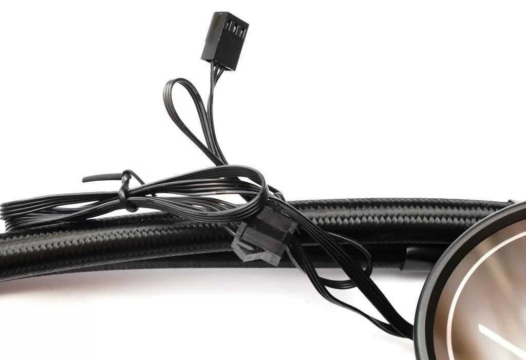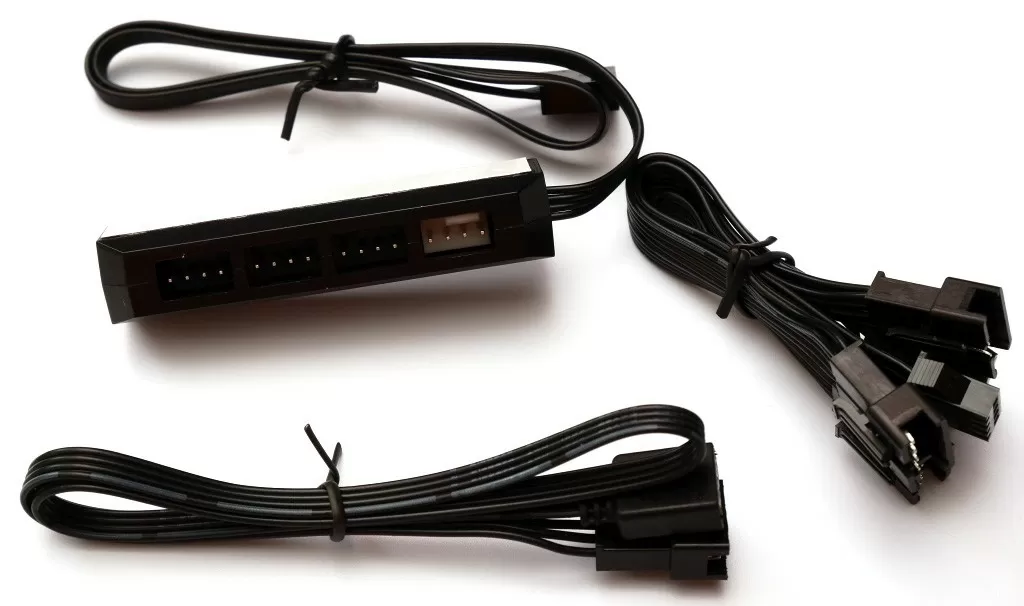 Ну и опять же напоследок глянем на кабели для подключения. Тут мы видим разветвитель для подключения четырёх вентиляторов к одному разъёму на материнской плате, но не забудьте заранее удостовериться, что материнская плата способна выдать требуемую мощность, скажем один вентилятор DF1202512CM-013 потребляет до 0,17 А, то есть четыре таких вентилятора будут потреблять чуть более 8 Вт. Также в комплекте идут два кабеля для подключения трёх элементов подсветки (в данном случае это помпа плюс два вентилятора) к 4pin LED коннектору на материнской плате. Хотя, если ваша материнская плата не поддерживает управление RGB подсветкой, то можно применить обходное решение – купить контроллер от обычной RGB LED ленты, используемой для освещения помещений.