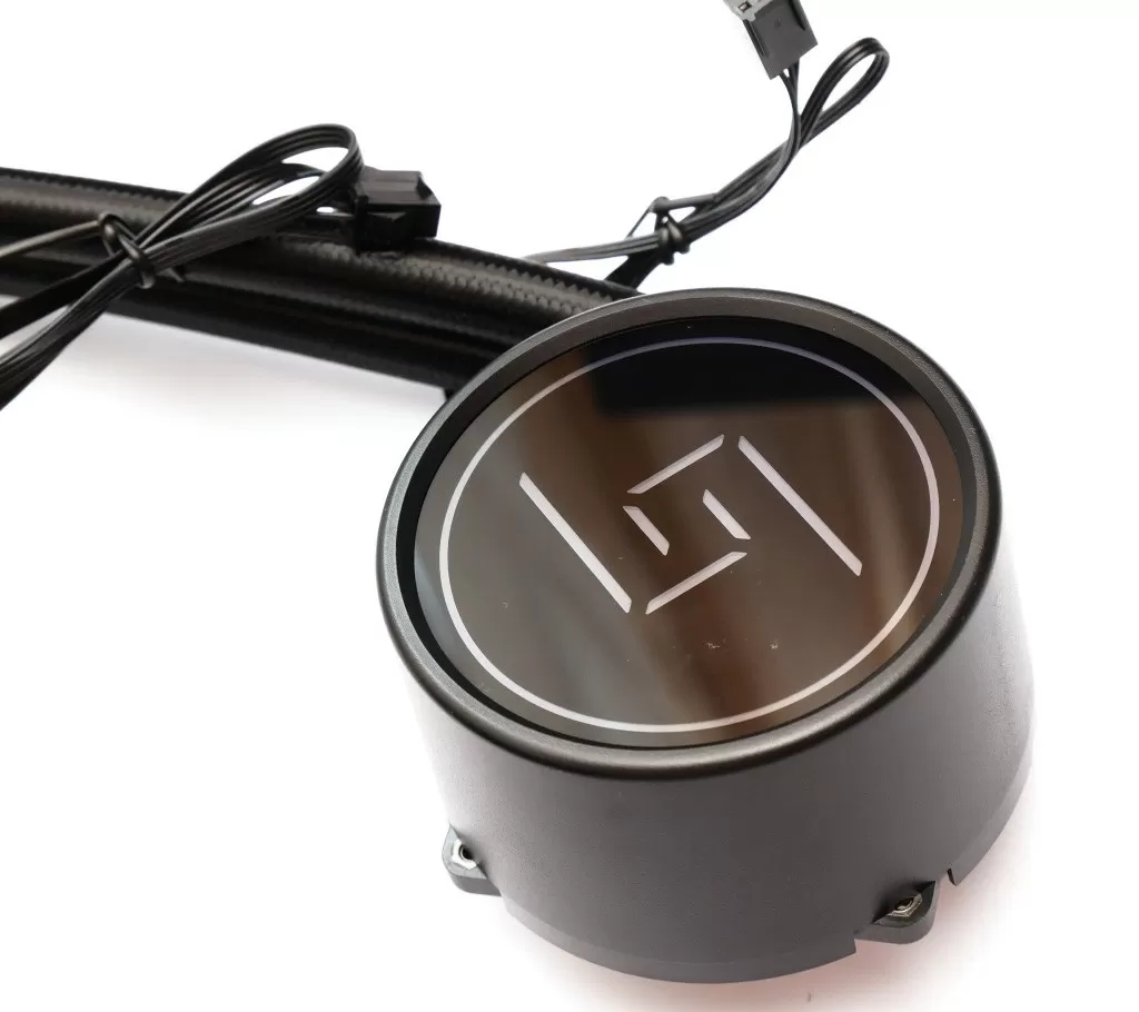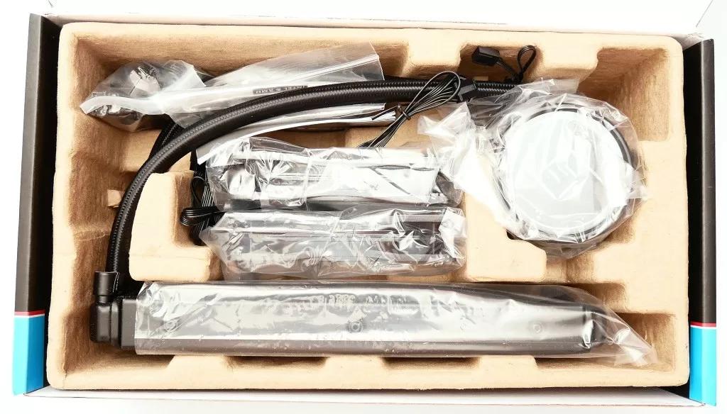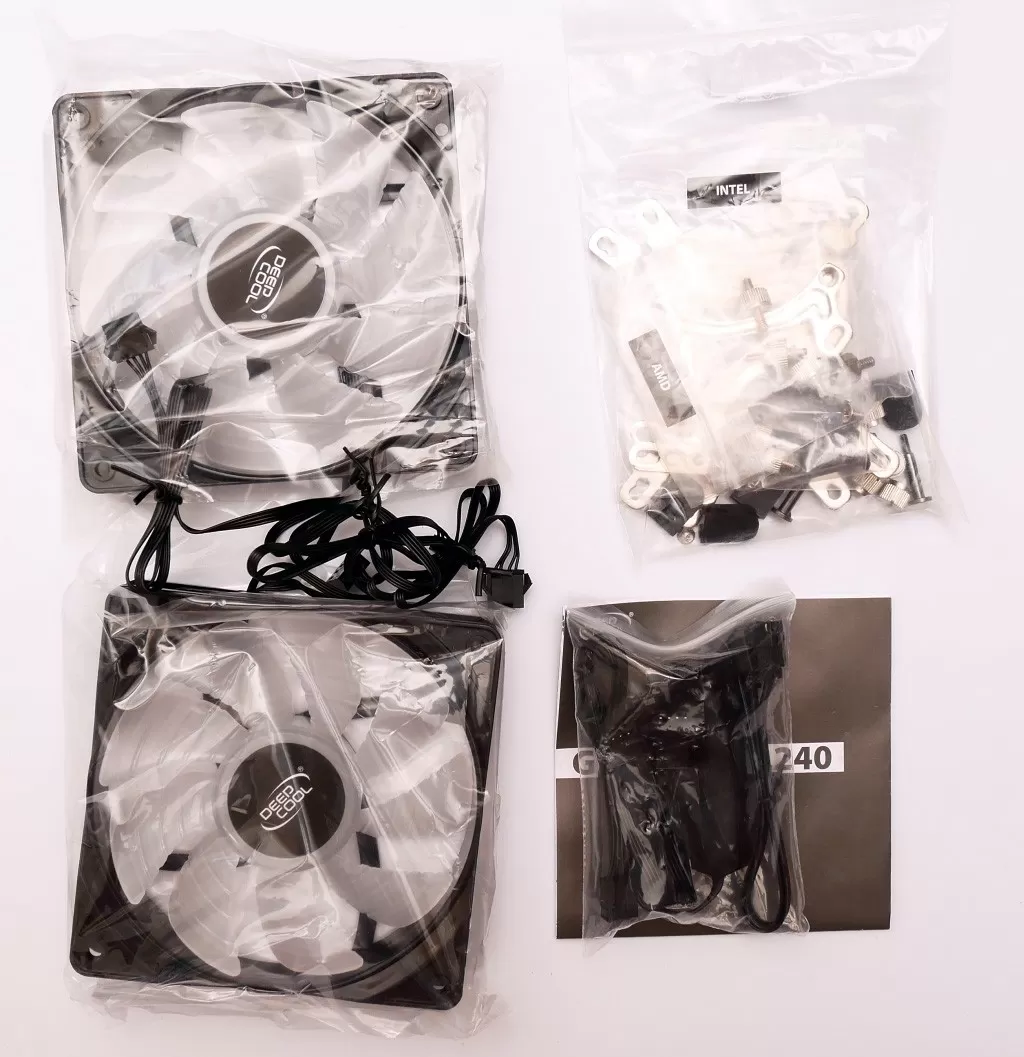 Система охлаждения поставляется в картонной упаковке практически стандартных (для данного типоразмера СВО) размеров. Конечно же в первую очередь волнует комплектация, но на самом деле тут почти всё стандартно: необслуживаемая система водяного охлаждения с 240 мм радиаторов и водоблоком, совмещённым с помпой, два 120 мм вентилятора, набор крепежа под все актуальные сокеты AMD и Intel, а также комплект аксессуаров для подключения. Как мы уже сказали, комплектация почти стандартная, именно почти, потому что как правило в комплекте с RGB СВО идёт контроллер, для того чтобы управлять подсветкой можно было самостоятельно, без подключения к материнской плате, поддерживающей технологии типа ASUS AURA Sync, Gigabyte RGB Fusion и т.п. Но в данном случае контроллера нет, а есть лишь кабель-переходник для подключения к мат плате посредством 4 pin LED коннектора. А вот хаб/разветвитель для подключения до четырёх вентиляторов к одному коннектору – присутствует.