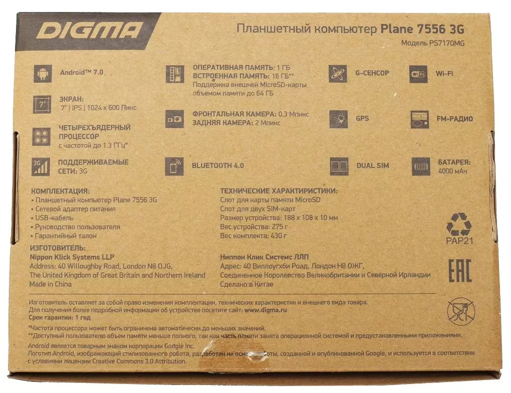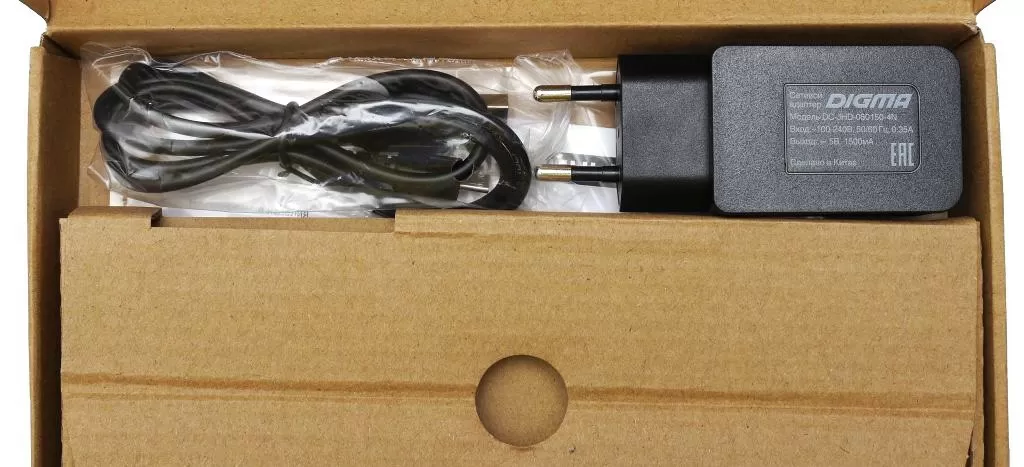 Планшет поставляется в картонной эко-упаковке компактных размеров. Комплектация включает в себя – сам планшет, microUSB кабель, USB сетевое зарядное устройство и стопочку макулатуры.