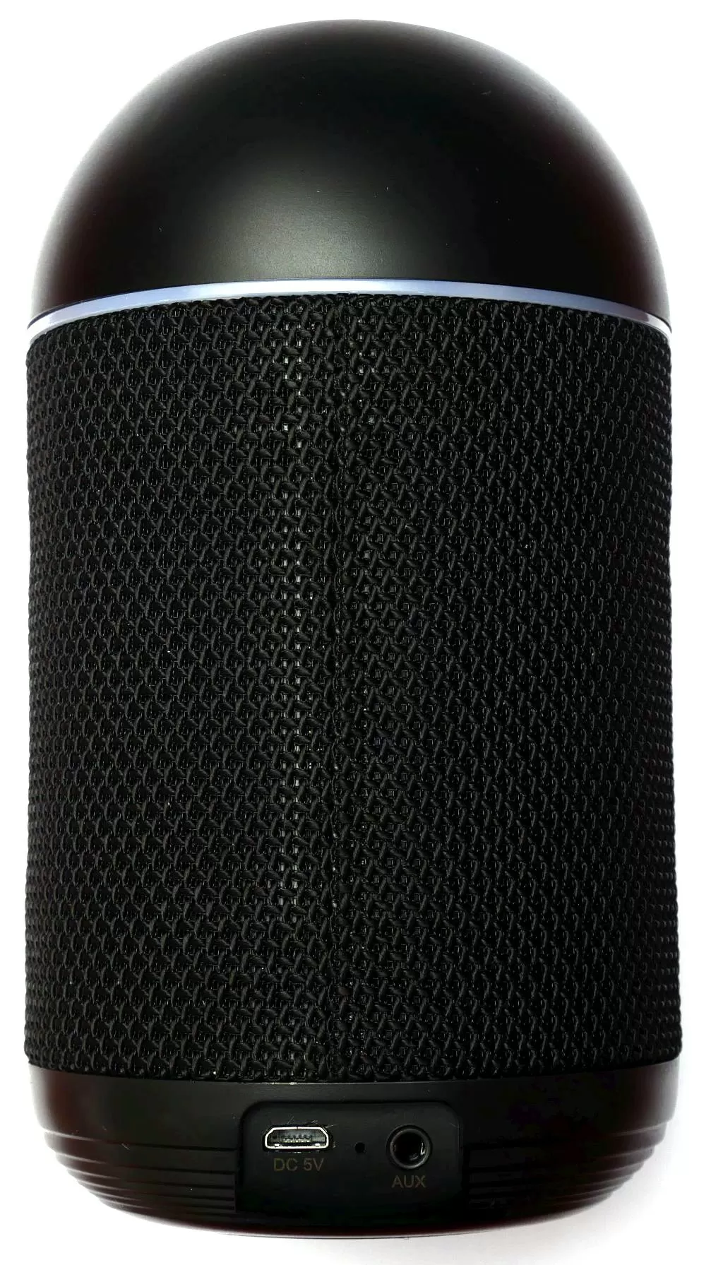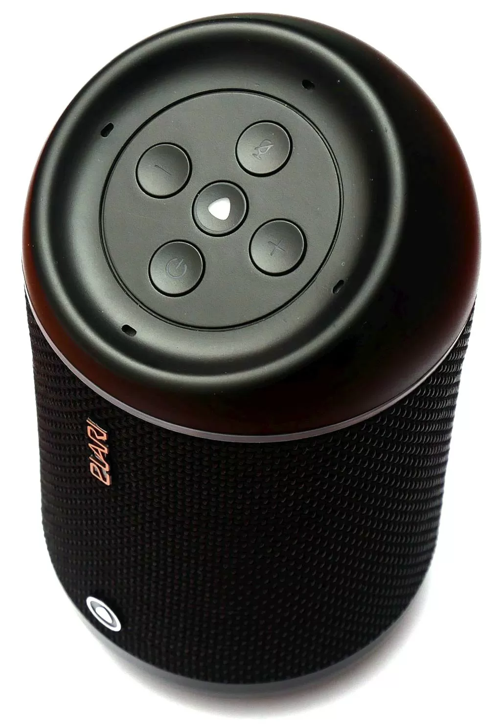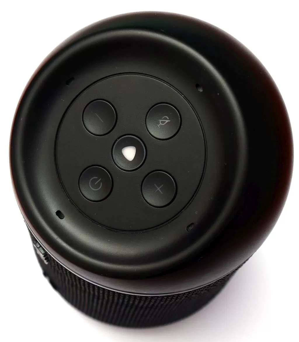 Верхняя часть имеет скос, на котором расположены кнопки управления: регулировка громкости, отключение микрофона, вызов Алисы и конечно же кнопка питания. Чуть ниже имеется прозрачное кольцо, за которым скрываются светодиодные индикаторы активности. Собственно, колонка имеет звуковое и визуальное подтверждение реакции Алисы на голосовые команды. Сзади снизу имеется порт microUSB для зарядки и аудио вход AUX, что позволяет подключать колонку не только по Bluetooth, но и по обычному аудио-кабелю.
