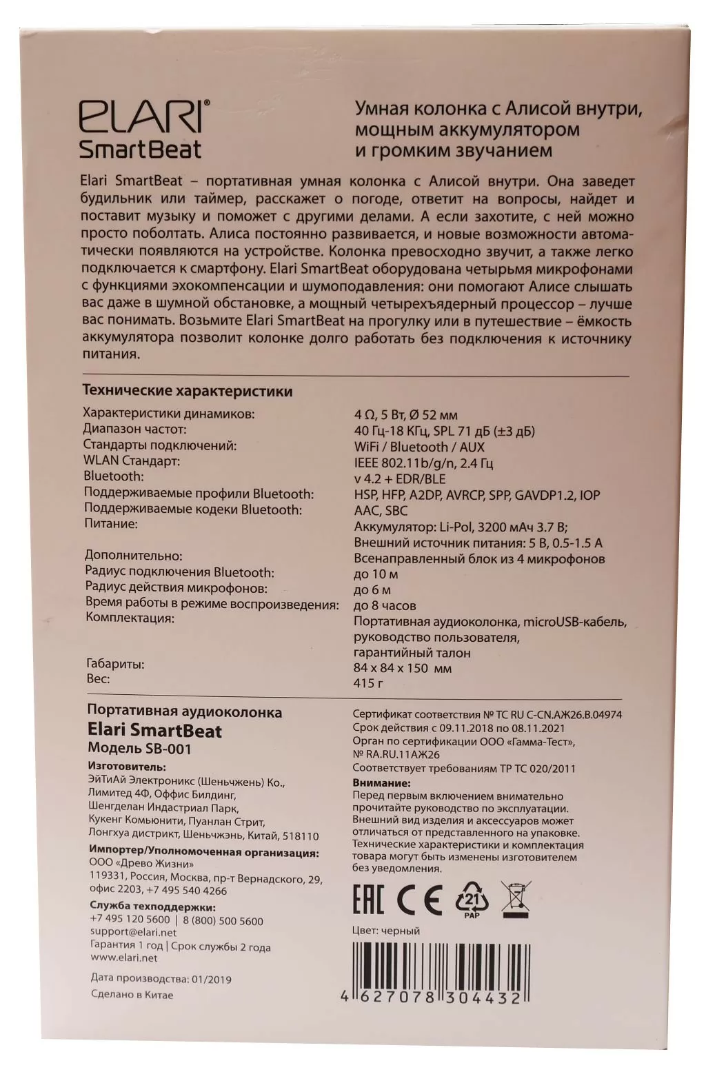 Устройство поставляется в упаковке средних размеров, при этом помимо колонки в коробке можно найти лишь microUSB-кабель да руководство пользователя и всякие буклеты Elari. К сожалению, в комплекте нет блока питания, но колонку можно подключить к компьютеру, ноутбуку или даже телевизору – главное, чтобы был свободный USB-порт.