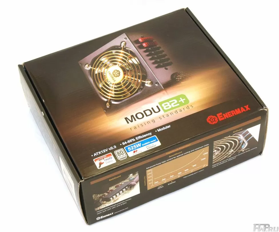 На лицевой стороне упаковки крупным шрифтом написано, что эффективность этого БП может составлять от 84% до 88%, что на фоне общей истерии энергосбережения должно вызвать трепет европейской души. Нам же с нашими тарифами на электроэнергию больше интересно наличие автоматической регулировки скорости вентилятора и возможность отключения кабелей питания (пресловутая модульность).