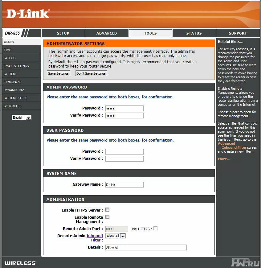 WEB-интерфейс D-Link DIR-855 по оформлению похож на интерфейс всех аналогичных устройств компании.