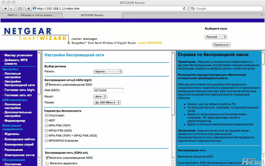 Ну, а самая изюминка этого роутера заключается в одновременной поддержке двух диапазонов Wi-Fi: 2,4 и 5 ГГц. Это позволяет организовать две независимые точки доступа, чтобы, например, передавать данные между двумя беспроводными ПК без потери скорости. Ведь при работе двух беспроводных устройств используется одна среда передачи данных (один частотный диапазон) и ее приходится делить, что негативно сказывается на скорости. При работе через разные точки доступа в разных диапазонах такая проблема не возникает в принципе (правда, это справедливо, если вы используете двухдиапазонный адаптер, такой как NETGEAR WNDA1300).