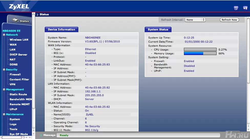 Что касается WEB-интерфейса, у ZyXEL он получился весьма удачным. На главной странице расположилась статистика по работе системы – здесь и статус по всем подключениям, и степень загрузки процессора/памяти.