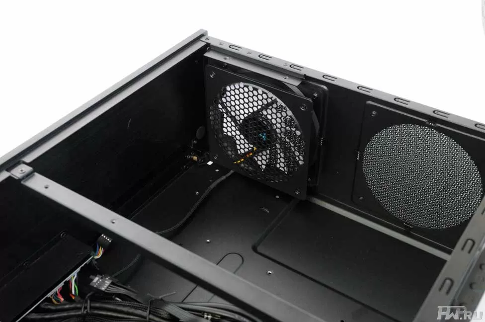 В Node 605 нет места для кабелей блока питания, поэтому лучше всего они прячутся между первым лотком и лицевой панелью корпуса. Учтите, что чем больше винчестеров вы установите, тем хуже будет охлаждение корпуса, поэтому для игрового железа оптимально будет остановиться на одном SSD или 2.5-дюймовом HDD. Жаль, что лоток нельзя снять вовсе, чтобы не мешать воздушному потоку. Кабели +12V для материнской платы лучше всего прокладываются под видеокартой, так что все равно придется выбирать блок питания с длинными кабелями.