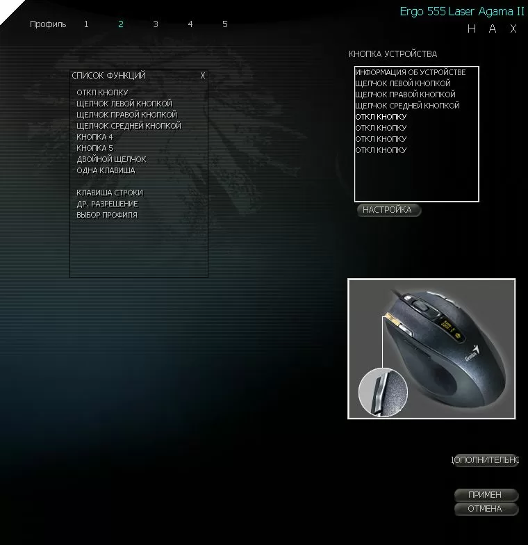 Окно настройки имеет интересное оформление, ровно, как и возможности настройки. Во-первых, настроить можно 7 кнопок (2 основные, нажатие скролла и четыре программируемые кнопки). Вариантов функций не очень много, но достаточно. Например, можно записать "макро" (последовательность нажатий клавиш клавиатуры) для реализации, например, так называемых комбо. Можно назначить одиночное нажатие какой-либо клавиши, или же быстрое переключение на нужный профиль.