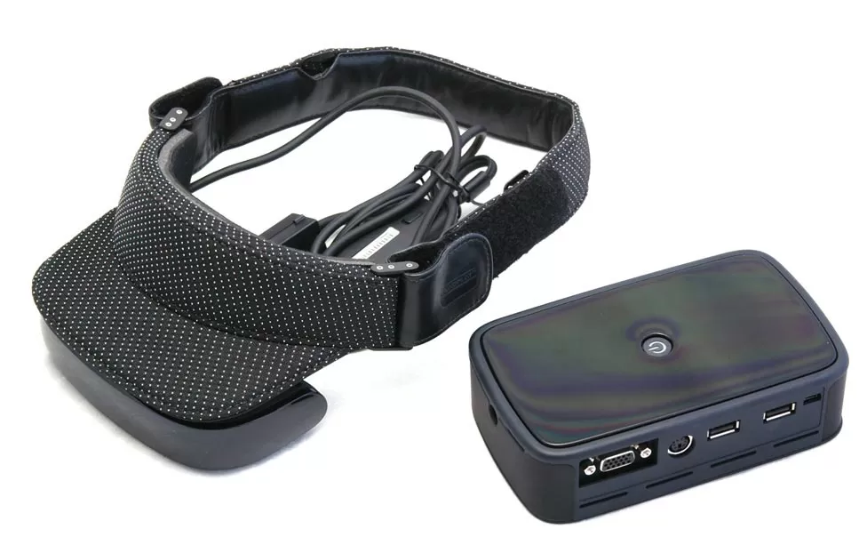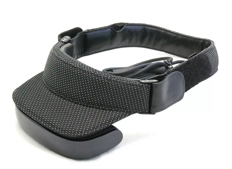 Посмотрим на сами видеоочки. Внешне они напоминают козырёк, какой можно встретить у клерков в американских ретро-фильмах.