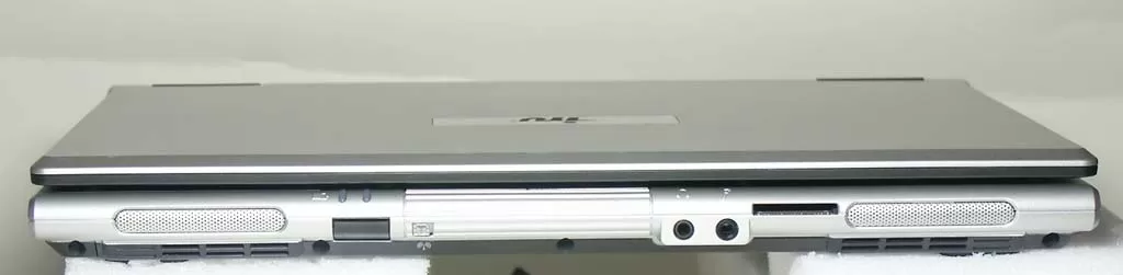 Спереди на корпусе установлены стереофонические динамики, индикаторы питания, 3.5 мм гнездо выхода на наушники и вход с микрофона. Так же на торце ноутбука расположен слот встроенного картридера. А под индикатором питания располагается окошко ИК-порта, хотя сам порт в этом компьютере не представлен.