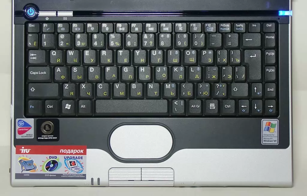 Сзади на компьютере установлено гнездо питания, ТВ-выход формата S-Video и третий порт USB 2.0. К этому USB 2.0 порту очень удобно подключить мышку или клавиатуру. Кстати, о клавиатуре. Ноутбук iRU Novia 3331W имеет компактную клавиатуру. Размеры компьютера заставили производителя использовать не только стандартные 18-миллиметровые клавиши, но и компактные, шириной 15 мм. Ход клавиш мягкий, нажатия чёткие. Дополнительных кнопки на ноутбуке всего две - WWW и E-Mail. Они располагаются в левой верхней части клавиатуры, рядом с кнопкой включения.