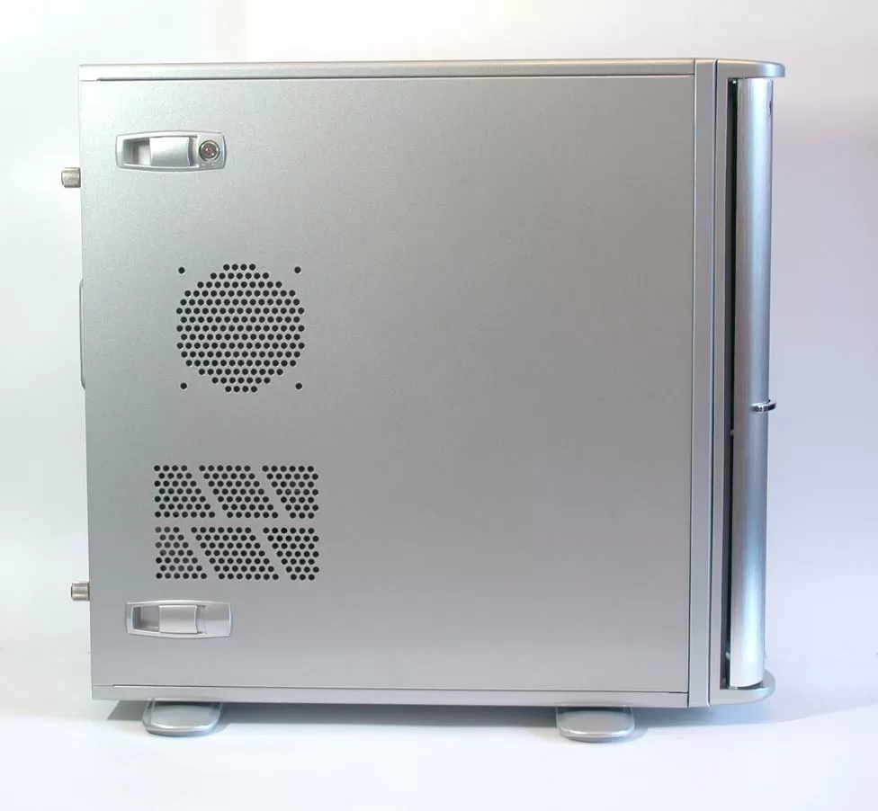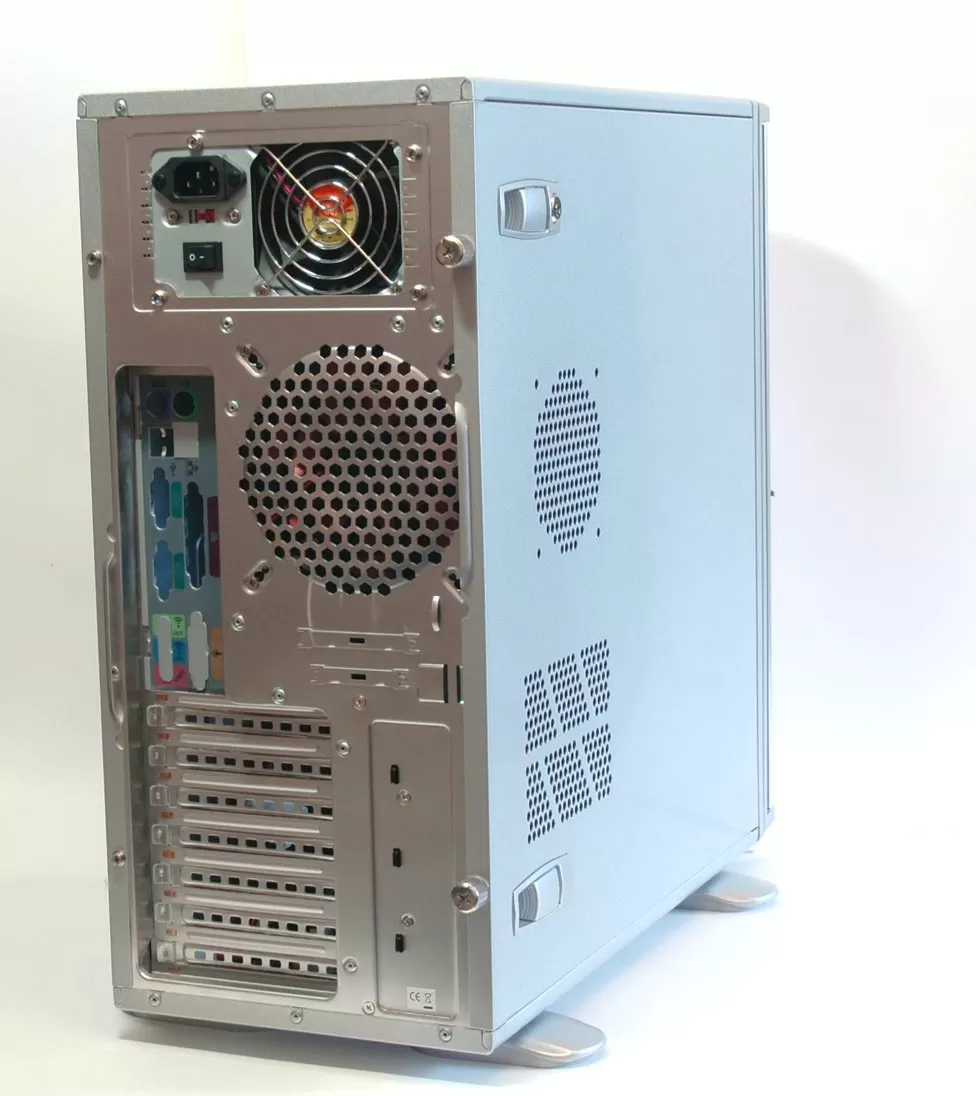 С обратной стороны корпуса, в общем-то, ничего интересного, нет даже ушка для навесного замка. С боковой стороны - тоже ничего особенного, даже решёточка для воздуховода CAG, рекомендованного для мощных процессоров Prescott, так и осталась неиспользуемой. Оно и понятно - на смену Prescott пришли менее жаркие процессоры.