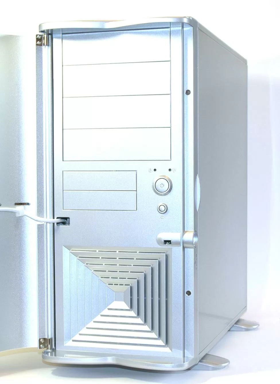 Лицевая панель, скрывающаяся под дверкой, в общем-то, ничего необычного из себя не представляет: стандартные выключатель питания и кнопка Reset, нажимающаяся только чем-нибудь тонким, два индикатора - питание и HDD, да, разве что, необычного вида вентиляционная решётка, которая большую часть времени будет скрыта от посторонних глаз за дверкой. Не пытайтесь устанавливать в Soprano DX какой-нибудь реобас или контрольную панель с выступающими ручками - дверка настолько близко прикрывается к поверхности лицевой панели, что попросту не сможет закрыться. Как и полагается современным корпусам, лицевая панель может открываться вместе с дверкой, чтобы дать вам доступ к внешним 5.25" и 3.5" отсекам.