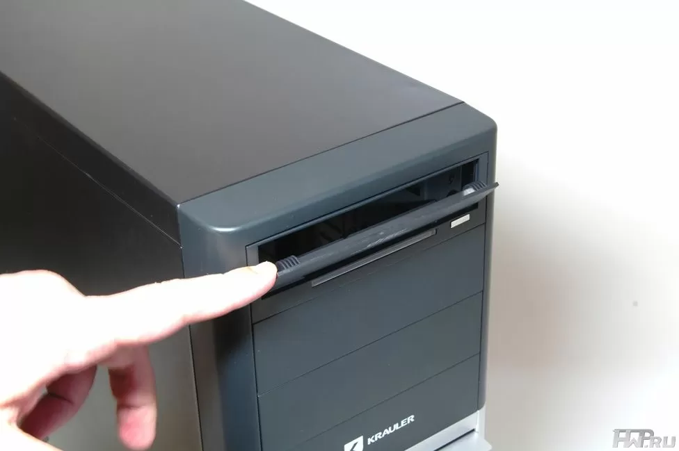 Оптический привод устанавливается в верхний отсек, где присутствует подпружиненная дверка, позволяющая использовать DVD-привод любого цвета, не боясь нарушить гармонию внешнего вида.