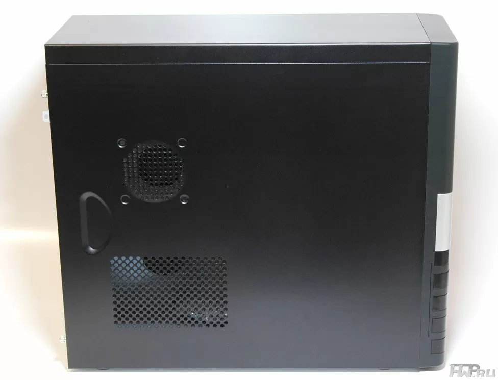 Посмотрим на корпус сбоку. В соответствии с современными требованиями, в боковой стенке размещены вентиляционные решётки для доступа воздуха к платам расширения и решёточка для воздуховода Intel CAG 1.1 (Chassis Air Guide). Однако самого воздуховода здесь нет, и установке бесшумного Heatpipe-кулера на процессор ничего не мешает.