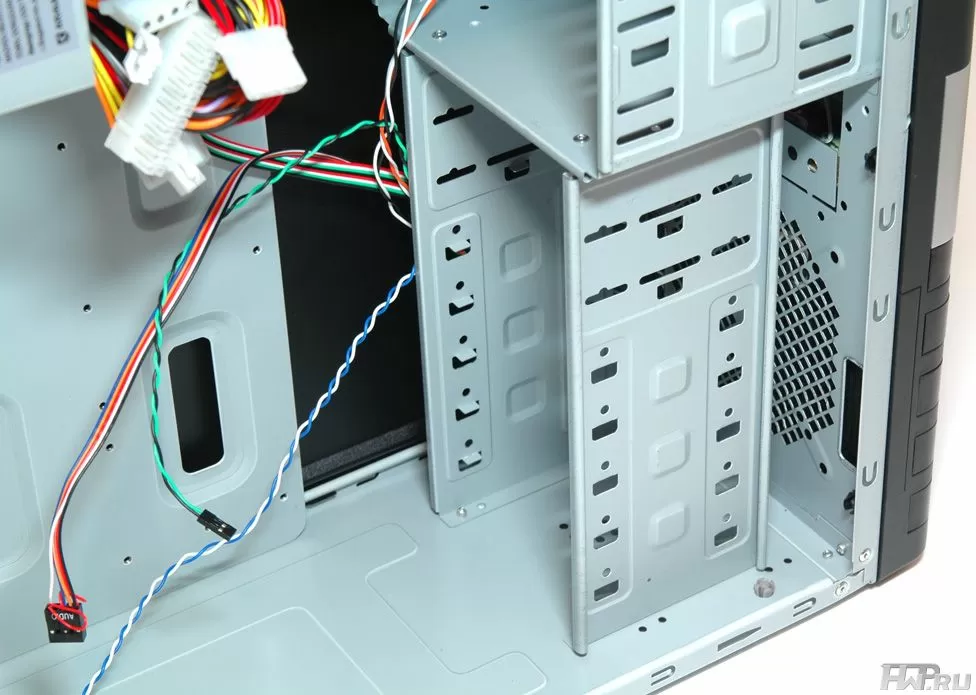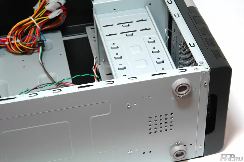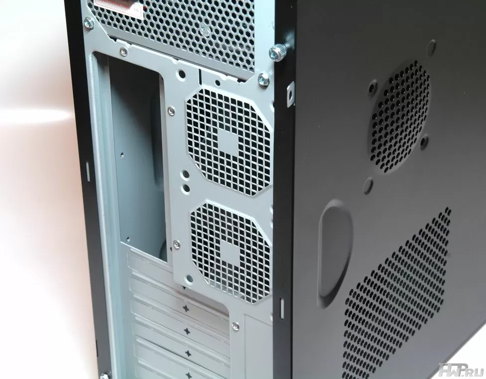 Рама для установки 3.5-дюймовых и 5.25-дюймовых отсеков так же имеет традиционную недорогую конструкцию. Установка устройств производится с использованием отвертки, закрепление - винтами. Никаких вибропоглащающих средств не предусмотрено, однако толстая сталь рамы и толстые изгибы на её краях придают конструкции существенную жёсткость. Так что дребезг, скорее всего, не появится.