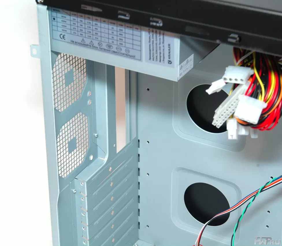 В нашем случае корпус Krauler M4719-400-D поставлялся с блоком питания мощностью 400 Вт производства HPC International. Вентилятор блока питания радует своей почти бесшумной работой на низких оборотах. Для снижения вибрации, он устанавливается одной стороной на панель материнской платы. При желании, вы можете установить в Krauler M4719 блок питания любой мощности, никаких ограничений на длинну здесь нет (в разумных пределах, конечно же).