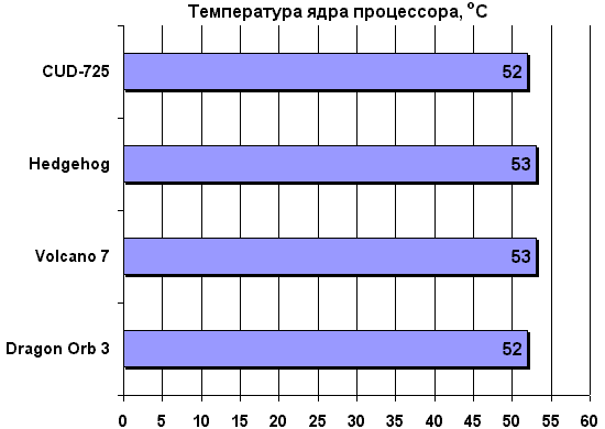 Крепление CUD-725 удобным не назовёшь. При установке охладителя на процессор и при его снятии вам придётся воспользоваться отвёрткой, или пинцетом, хотя надо сказать и про хорошую сторону - стальная скоба легко изгибается, поэтому приложения титанических усилий от вас не потребует, а держать кулер будет отлично. Что же можно сказать про шум? Вентилятор CUD-725 вращал пропеллер с частотой 5037 Об/мин, что на 20% больше, чем было заявлено производителем. Естественно, уровень шума был выше, чем обещанные 32 дБ. Так что охладитель своим шумом сравнивался с "семитысячником" третьего дракона. Некоторые кулеры Evercool поставляются с установленной на вентилятор сигнализацией. Здесь её нет, но если вы находитесь рядом с компьютером, то безошибочно определите, работает ли CUD-725, или нет, конечно, если его шум не заглушают ещё несколько таких же в компьютерах по соседству.