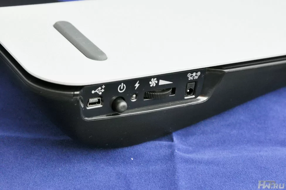 С левой стороны охлаждающей подставки также компактно расположились мини-USB порт (питание + передача информации), выключатель, небольшой светодиодный индикатор питания, колёсико с бесступенчатой регулировкой скорости вращения вентиляторов, а также разъём для внешнего блока питания (подключается опционально).