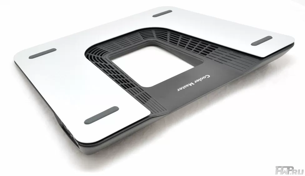 Верхняя часть подставки Infinite EVO – это алюминиевая крышка, которая окрашена специальной смесью из краски и песка (для обеспечения лёгкой шероховатости поверхности), что делает её внешний вид похожей на дизайн новых ноутбуков MacBook Pro, а ещё она идеально подходит к этим ноутбукам. Алюминий в действительности хорошо помогает рассеивать тепло, к тому же эта поверхность очень приятная на ощупь. Пожалуй, тайваньским инженерам удалось добиться гармоничного сочетания дизайна и функционала устройства. На верхней крышке также расположились четыре резиновые вставки, которые помогают удерживать ваш ноутбук в нужной вам позиции, предотвращая его соскальзывание, а ещё они приподнимают его на небольшое расстояние, обеспечивая улучшенную циркуляцию воздушного потока для ещё большей эффективности охлаждения. Логотип производителя аккуратно размещён почти в самом верху пластикового "окна" U-образной формы.