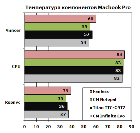 Для тестирования использовался ноутбук MacBook Pro с диагональю 13 дюймов. Это очень мощный ноутбук в алюминиевом корпусе, который имеет несколько особенностей охлаждения. Во-первых, при работе с питанием от сети он сильно нагревается сверху, над клавиатурой, а во-вторых - на дне корпуса нет никаких вентиляционных отверстий - горячий воздух отводится под экран. Тестирование было достаточно простым: при питании от сети с NAS-а было включено воспроизведение HD-видеофайла. Через 30 минут снимались показатели температуры с компонентов ноутбука. Кулеры работали на максимальной скорости.