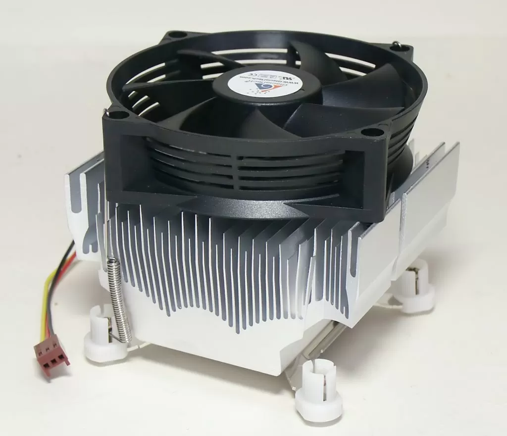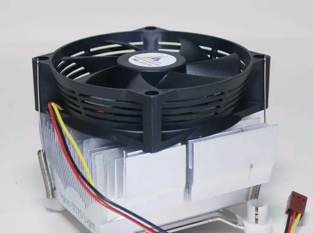 Сверху на радиатор установлен большой вентилятор, который закрепляется двумя шурупами и двумя пружинами (!). Отличительная особенность вентилятора состоит в том, что он забирает воздух не только сверху, но и с боков благодаря специальным щелям в его корпусе.