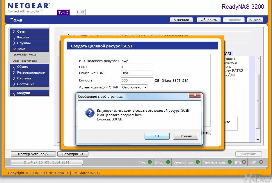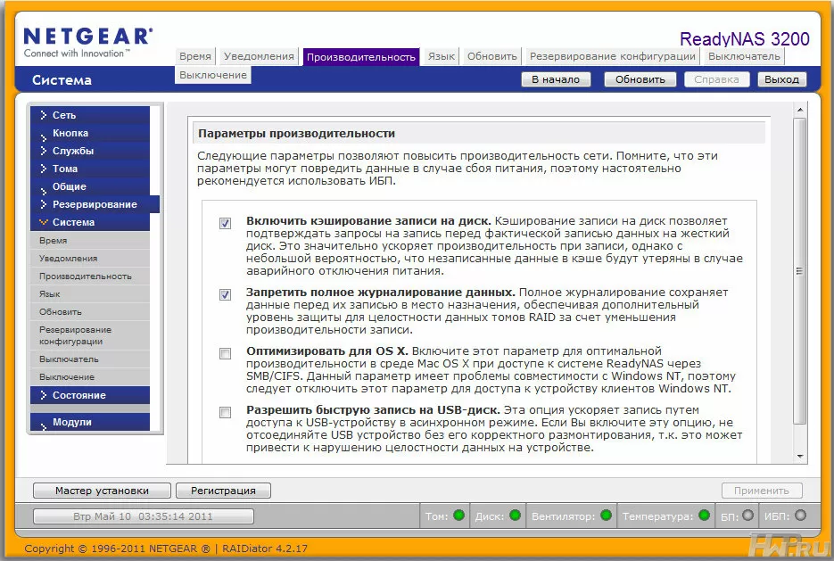 Год от года NetGear совершенствует свою операционную систему RAIDiator, и мы тестируем уже 4-е поколение версии 4.2.16. Так как ReadyNAS 3200 поставляется уже настроенным, то все, что вам остается сделать - это сменить пароль администратора и произвести сетевые настройки. Для поиска NAS-а в сети проще воспользоваться утилитой RAIDar, или зайти в меню вашего роутера.