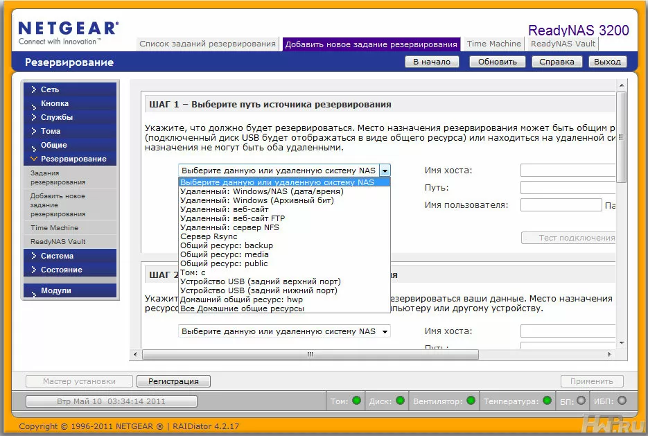 NetGear ReadyNAS 3200 не просто может использоваться для хранения резервных копий - этот NAS может сам создавать резервные копии ваших ресурсов, и позвольте объяснить вам, насколько это важно. Обычно, когда вы настраиваете бэкап, вы делаете это на клиентской машине, указывая NAS лишь в качестве сетевой папки для хранения данных. Если в вашей системе стоит десяток таких клиентов, а на каждом из них ещё по 2-3 задания на бэкап, то вам наверняка будет трудно просчитать расписание, чтобы несколько заданий не выполнялись одновременно, ведь это может привести к существенному падению производительности заданий и сети в целом.