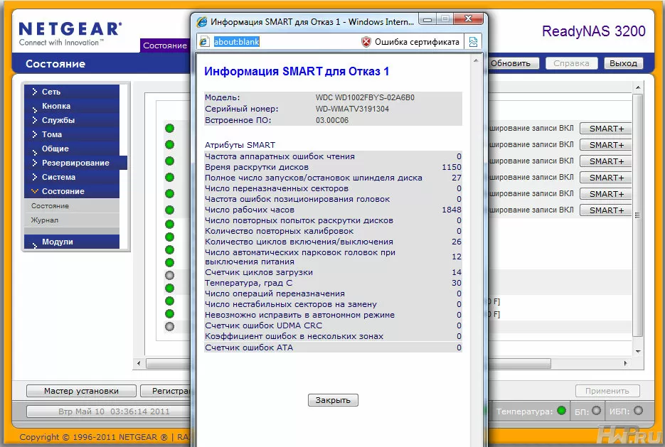Сервер ReadyNAS 3200 выводит полную информацию о SMART статусе жестких дисков, а так же о состоянии блоков питания, температурах и вентиляторах системы. При возникновении аварийной ситуации или, допустим, увеличения количества переназначенных секторов на одном из жестких дисков, ReadyNAS может отправлять сообщения на почту.