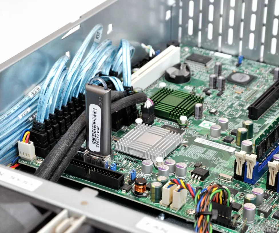 Материнская плата - SuperMicro X7SB3-NI015, использующая чипсет Intel 3210 с южным мостом ICH9. Один из встроенных USB портов отдан под флешку с операционной системой СХД - простое и понятное решение. Очевидно, для большей надежности флешку можно клонировать, а второй внутренний порт возможно использовать для аппаратных ключей.