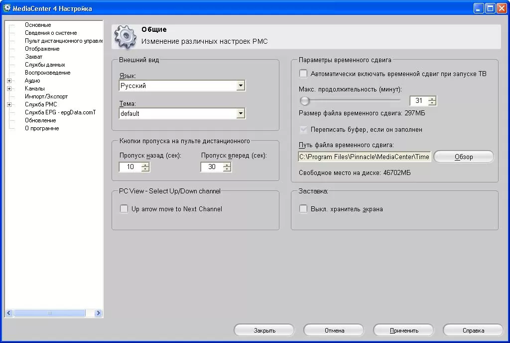 В общих настройках имеет смысл включить опцию автоматического включения временного сдвига при запуске ТВ. В этом случае компьютер начнёт записывать телетрансляцию в буфер не в тот момент, когда вы нажмёте на пульте ДУ кнопку паузы, а сразу при активации ТВ-режима, и в результате вы не потеряете ни секунды при переходе в режим TimeShift. А кроме того, у вас будет создаваться запас по времени, и вы сможете легко осуществить перемотку телевизионной программы назад, если что-то не расслышали или кто-то вас отвлёк.