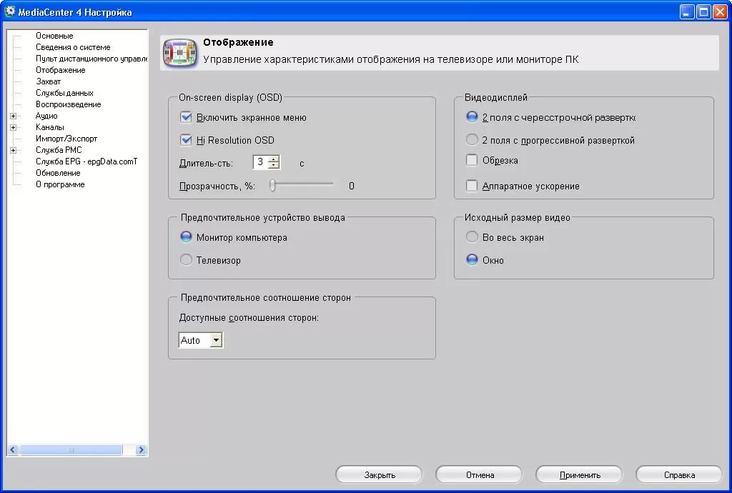 В настройках изображения было бы логично увидеть параметры яркости, контрастности, цвета и т.д. Но здесь всего лишь позволяется включить экранное меню (OSD), настроить устройства вывода изображения (монитор или телевизор), поменять чересстрочную развёртку на прогрессивную и добавить аппаратную обработку картинки. Параметров записи видео так же не много. Система поддерживает только собственные кодеки и не допускает вас к расширенным параметрам (разрешение, компрессия). Зато имеются заготовки для записи в форматах Apple iPod Video и Sony PSP. Кстати, о кодеках. После установки на нашем компьютере Pinnacle MediaCenter потребовал, чтобы мы зарегистрировали наш продукт на сайте компании. В этом случае нам станет доступным кодек MPEG 2. И хотя регистрация бесплатна, сделать это на стенде, не подключенном к интернету, оказалось проблематичным. А без кодека MPEG 2 пользователю не доступны не только запись в DVD формат, но даже просмотр DVB-T.