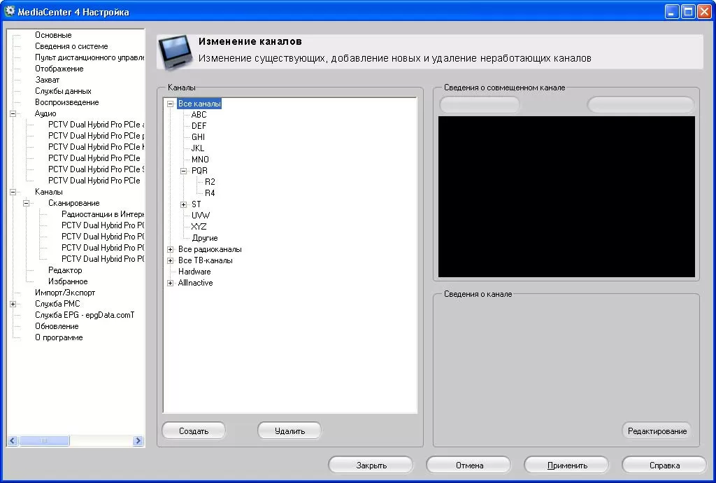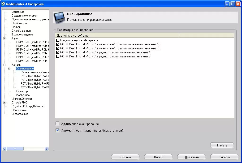 Перед поиском каналов вы выбираете, какой сигнал с какого антенного входа следует брать (аналоговое ТВ, DVB-T или радио). Методов сканирования два - обычное и аддитивное. Поиск проходит быстро, но некоторые каналы приходится затем подстраивать вручную. В качестве дополнительных "сладостей" Pinnacle MediaCenter может автоматически назначать эмблемы разным каналам (не для России, крошка) и работать с электронной программой через сервис EpgData.com (за деньги и не для России).