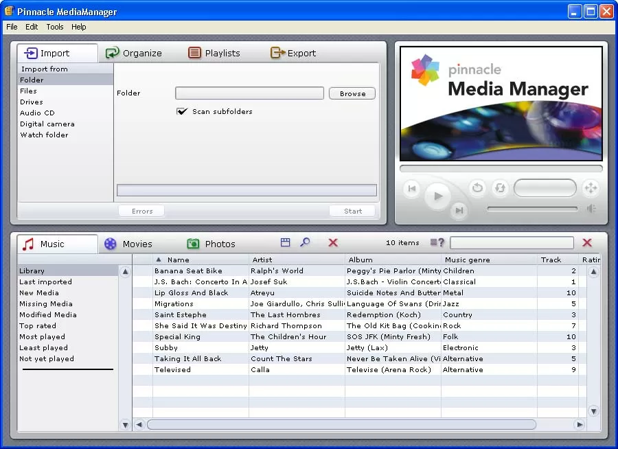 Возможности Pinnacle MediaCenter не замыкаются на показе телепрограмм, приёме радио и т.д. Вы можете работать с различными типами медиа-файлов: музыкой, фотографиями, своими записями и даже интернет-радиостанциями. Чтобы содержать свою медиа-библиотеку в порядке, вам пригодится программа Pinnacle MediaManager, являющаяся частью медиа-центра. С её помощью вы сможете сортировать свои записи, удалять ненужные, организовывать плейлисты и записывать файлы на DVD. Если же у вас установлен беспроводной медиа-плеер Pinnacle ShowCenter 200, то будьте уверены - он подружится с мультимедийной оболочкой и вы получите возможность использовать его для просмотра файлов на телевизоре.