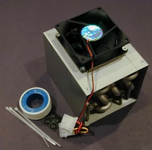 А вот это - уже охладитель для воды. Его цель - понизить температуру воды, используемой для охлаждения процессора. Очень полезная вещь, если вы используете не проточную воду. Что меня здесь удивило, так это то, что диаметр входной и выходной трубки намного меньше диаметра остальных трубок. Зачем? Зачем делать трубки радиатора большего размера, ведь давление и поток воды определяются входной и выходной трубками?