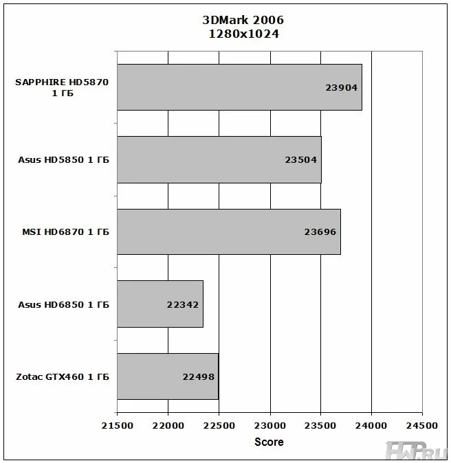 3DMark06 как всегда подчеркивает зависимость оценки от производительности процессора. Не смотря на это можно заметить разницу в результатах теста при использовании разных видеокарт. ASUS HD6850 DirectCU в данном тесте занимает почётное первое место с конца.